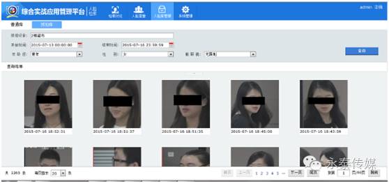 系统可对前端人脸抓拍机回传的抓拍数据进行建模、存储,建立海量人脸特征数据库,并支持根据性别、年龄段、是否戴眼镜等特征,以及抓拍时间、地点等信息对卡口抓拍人员进行快速搜索。